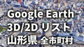 この表は、福島県内の市町村について、Google Earth での表示状況(3D/2.5D/2D)をまとめたものです。(This table shows whether cities in Yamagata Prefecture are available in 3D, 2.5D, or 2D on Google Earth.)