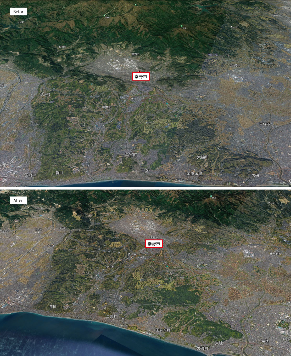 秦野盆地~大磯丘陵周辺のグーグルアース3D境界線のビフォーとアフター