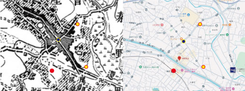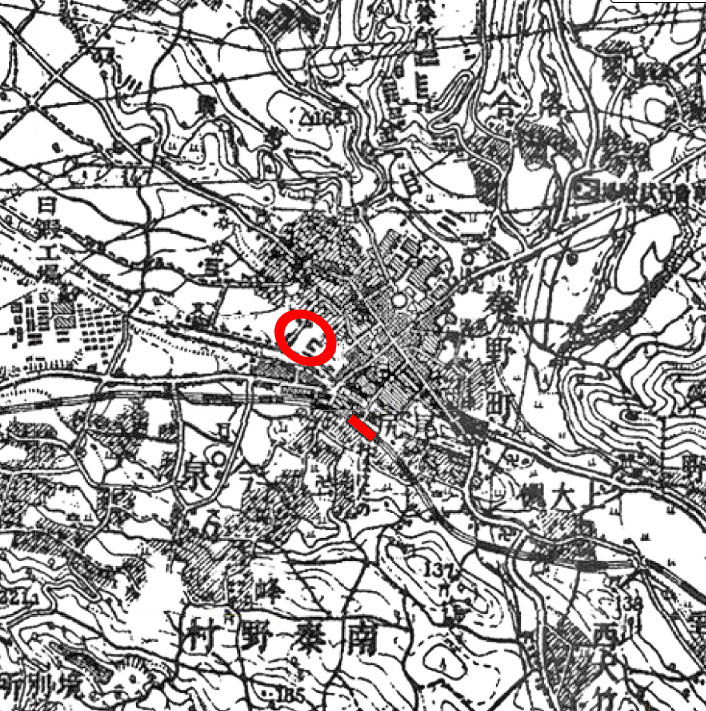 近代以降の秦野市の賑わいの中心。現在は小田急線秦野駅周辺というもう1つの賑わいの場所がありますが、小田急線の秦野駅開業前の古地図を見ますと秦野市にとって明らかに本町四つ角が唯一無二の中心だとわかりますね(赤い点が小田急線 秦野駅の場所)。
