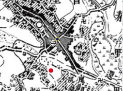 赤い丸は小田急線の秦野駅の場所です。古い地図に当てはめると当時の街外れ(旧南秦野村)に駅を設置したことがわかります。