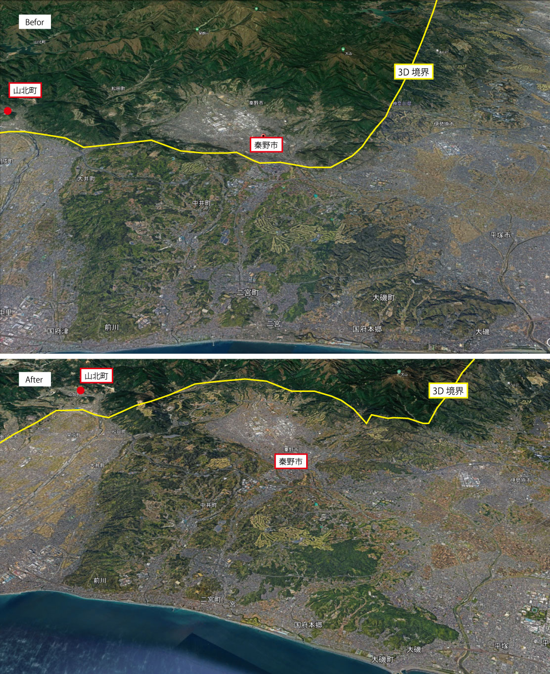 秦野盆地周辺のグーグルアース3D境界線のビフォーとアフター