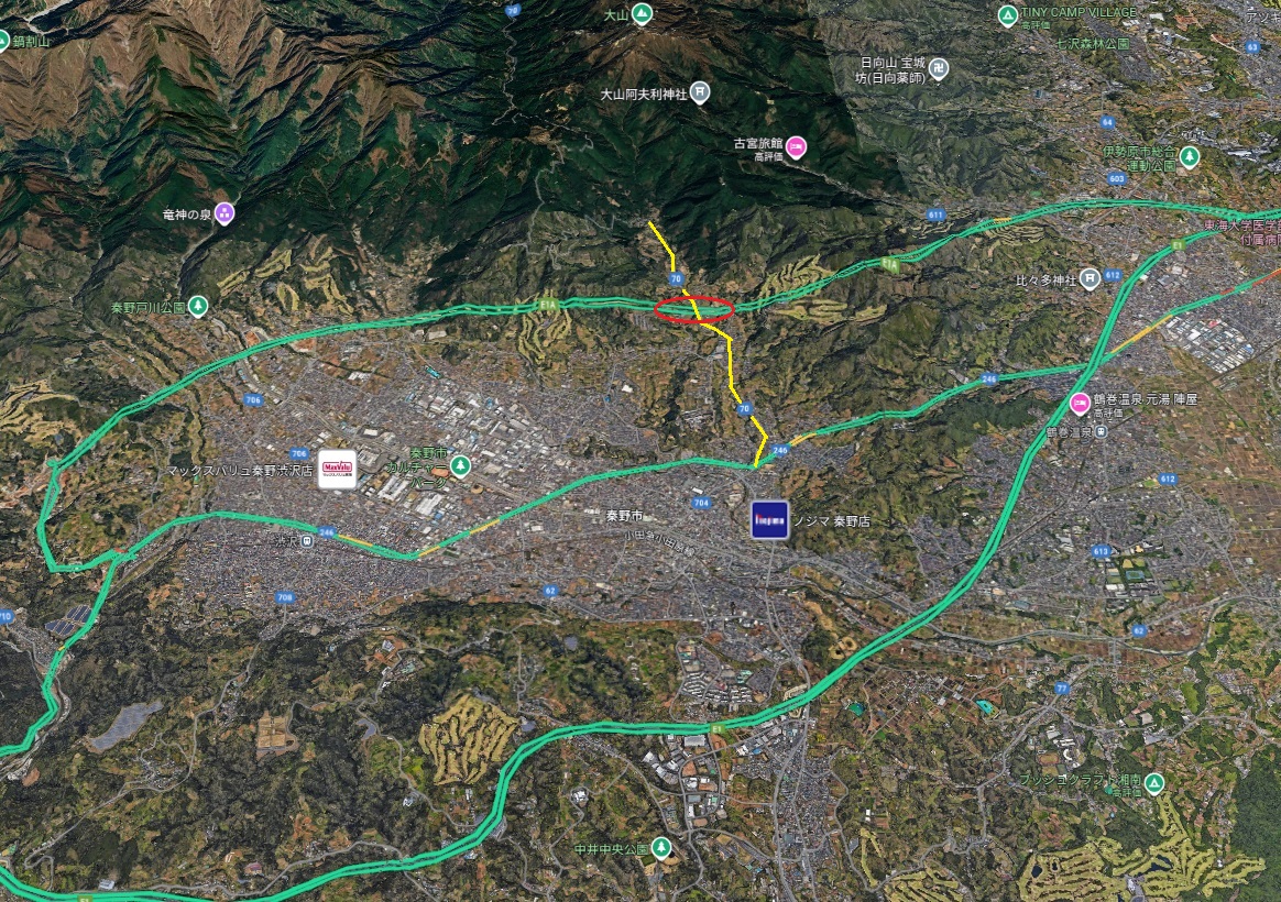 神奈川県道70号線(黄色い線)は秦野市内から丹沢登山道やヤビツ峠に向かう道。