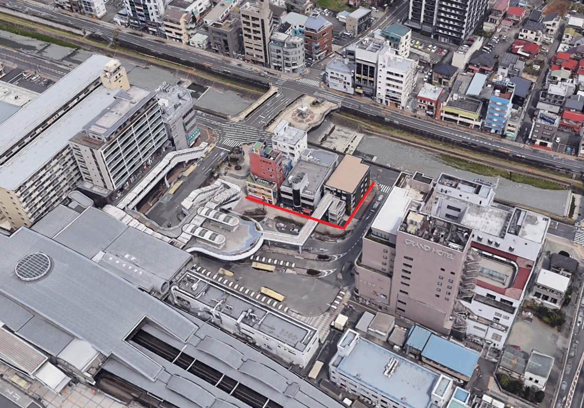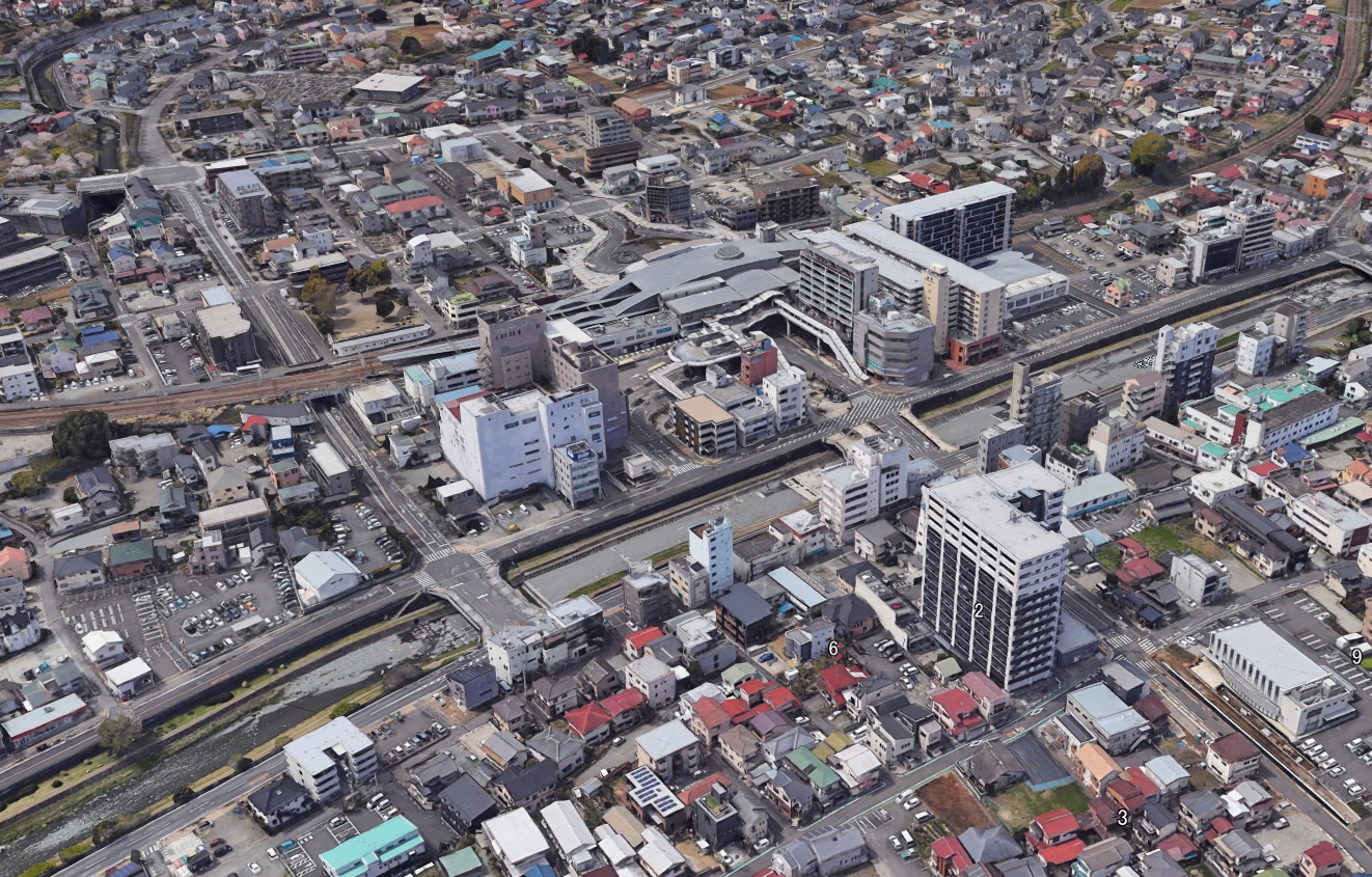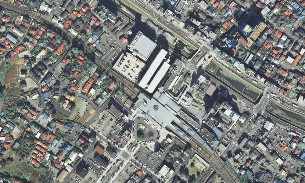 駅前には広場やロータリーなどは見られず、現在の駅前広場となる区域には街区がありその中にいれば駅と川の存在を忘れてしまいそうです。駅前には他の路地よりも広い道路があり街路樹などもあるように見えます。